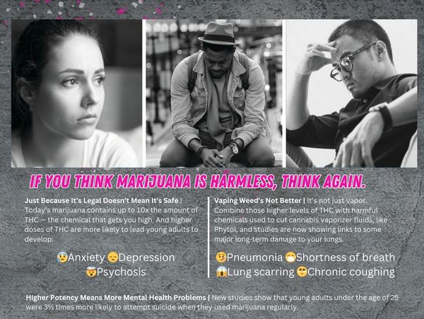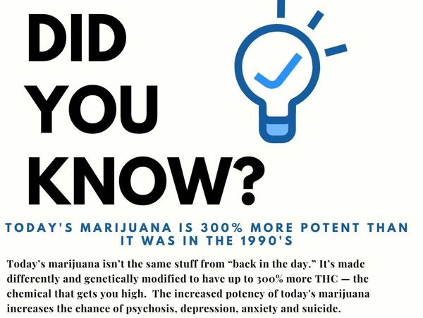 Laws are changing around weed. That means it's safe, right? Wrong. Today's marijuana is 300% more potent than it was in the 90s which means 300% more THC The chemical that gets you high. Higher levels of THC lead to an increased risk of things like anxiety, agitation, paranoia and psychosis. Just because it's legal doesn't mean it's safe.